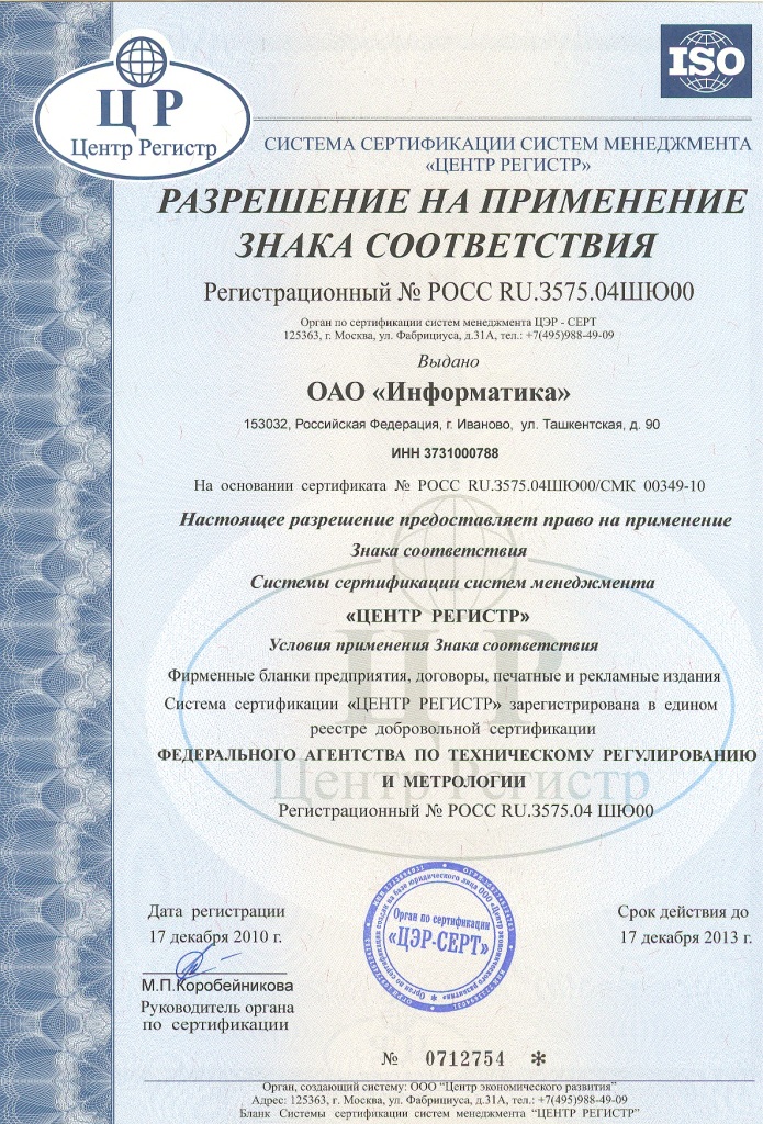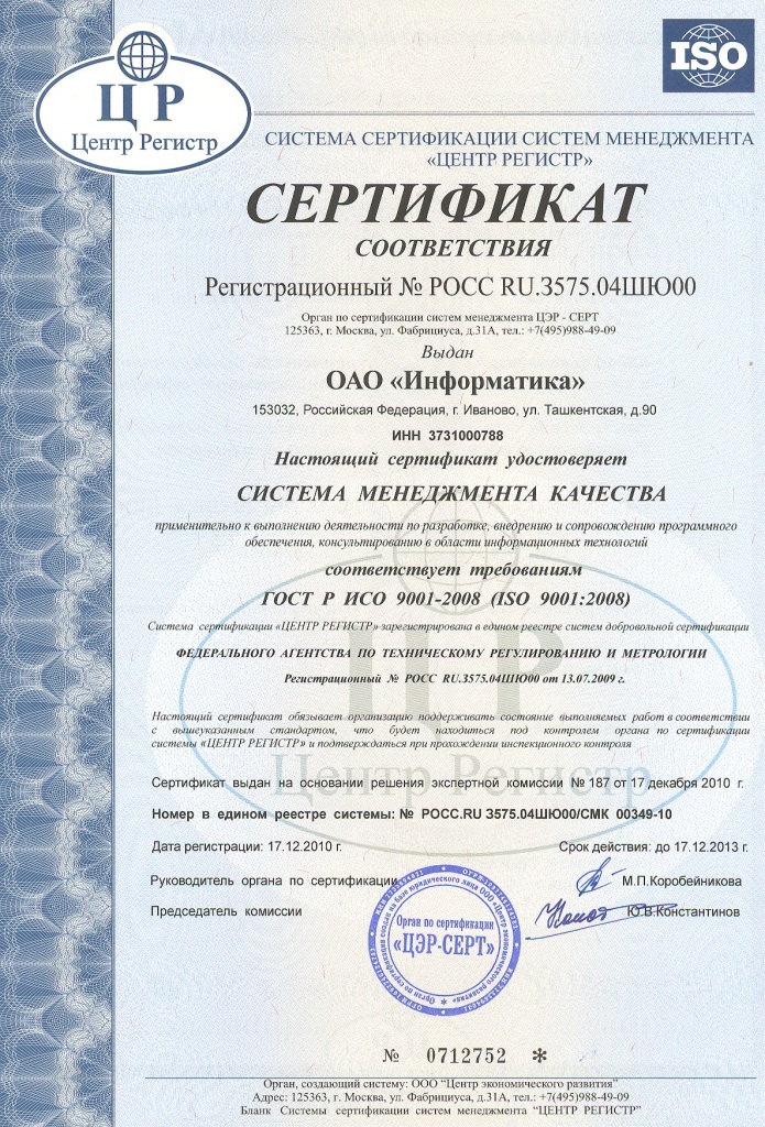 ОАО "Информатика" успешно прошла сертификацию системы менеджмента качества на соответсвие международному стандарту ISO 9001:2008 применительно к выполнению деятельности по разработке, внедрению и сопровождению программного обеспечения, консультированию в области информационных технологий.
